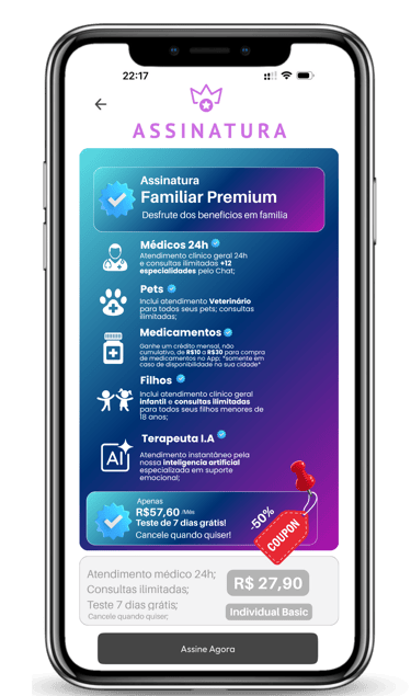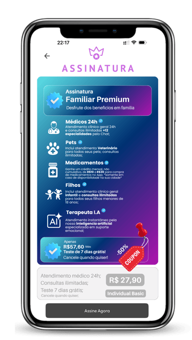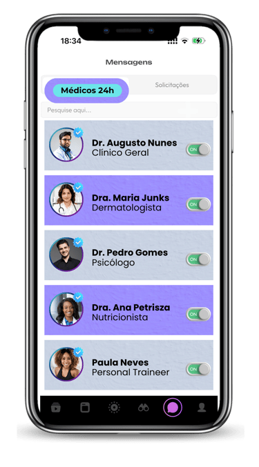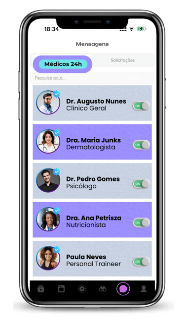 Atendimento médico 24h e consultas ilimtadas diretamente pelo Chat, áudio ou vídeo; +30 Especialidades;