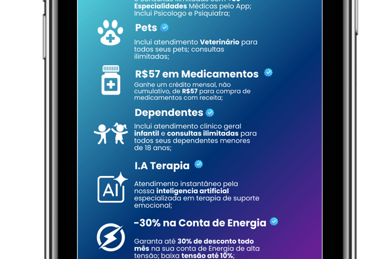 Até 80% de desconto +2 mil lojas grandes marcas como CacauShow; Americanas; Adidas; e muito+; +300 Cursos EAD como ingles, I.A +Carteirinha de Estudante para desconto no Cinema, Shows e Eventos;