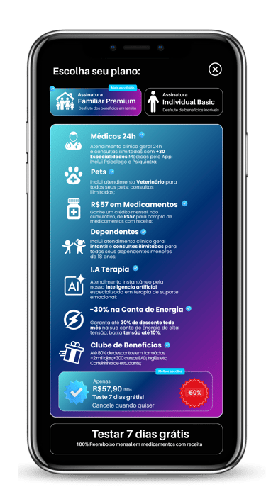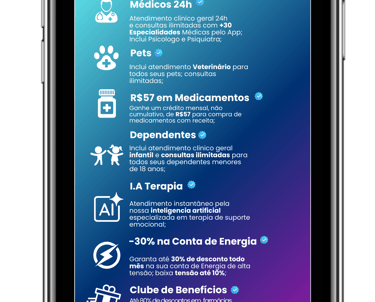 Atendimento médico 24h e consultas ilimitadas diretamente pelo Chat; +30 Especialidades;