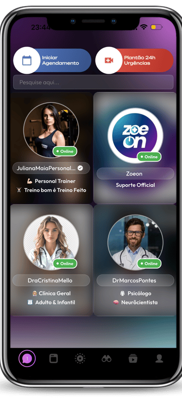 Porém, estamos convictos que não será necessário, pois sabemos que nossa tecnologia conecta você com profissionais éticos e qualificados para você ter uma experiência de qualidade, ágil e fácil, para sua saúde e de sua familia. Temos convicção que você tera uma grande transformação através de todo conteúdo de saúde & bem-estar, gerado pelos profissionais em nosso App;